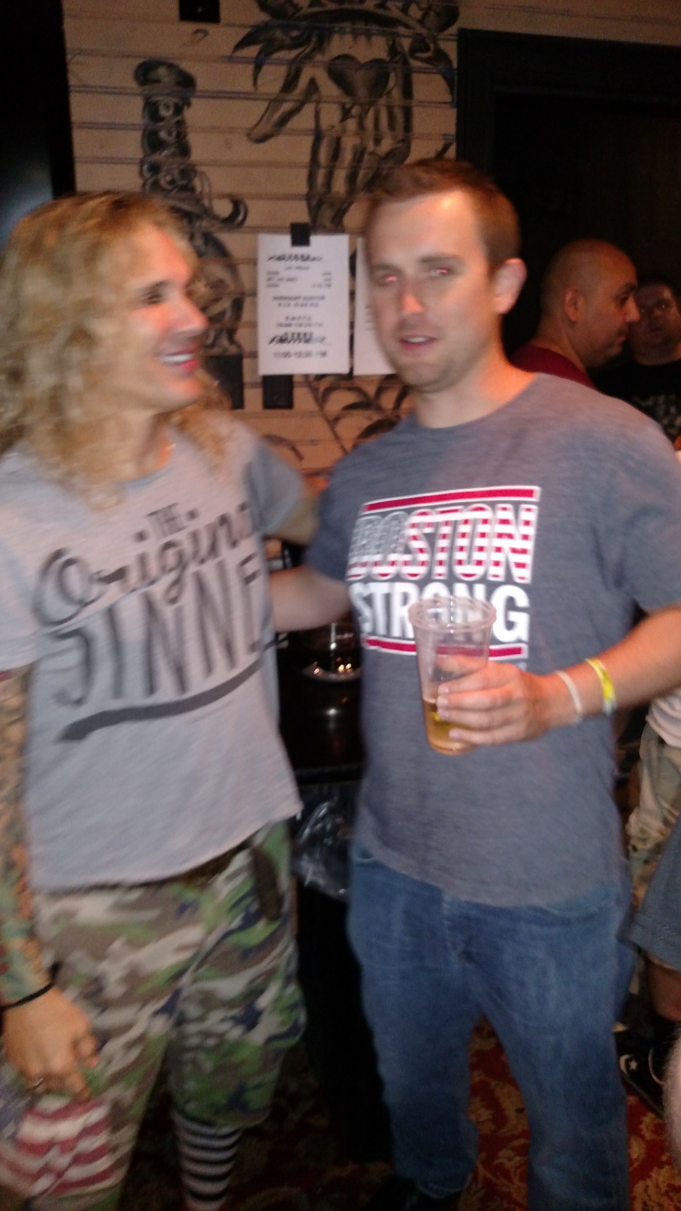 Now this wasn’t a quick we were in there and we were out, we straight chilled with them. The lead singer of Elvis Monroe, Bryan Hopkins was wicked cool as was his model girlfriend. I got into a conversation with Michael Starr and asked him all about their music (my girlfriend got embarrassed when I mentioned she used to not like them, but he couldn’t of been nicer and told her to not to take the lyrics seriously). He asked my opinion on deflategate and I got a few laughs out of him. I asked what his fav Steel Panther record was and he said the first one because people know songs from it, even if they’re not familiar with the band. He was about to tell me about how they used to be Metal Skool a cover band, but I finished his sentence and he was pumped I knew about their old band. Also, two funny gaffes that happened, Ranna asked a groupie if she was one of their wives (ROCKSTAR LIFESTYLE BABE Chill!) Also, a girl we had met at the show with her boyfriend was backstage with her guy nowhere in sight, trying reaaaaal hard to impress the band.